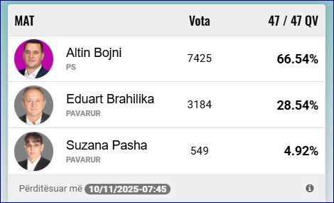 Ka përfunduar edhe numërimi i kutive të votimit në Bashkinë e Matit. Sipas të dhënave më të fundit të publikuar nga Komisioni Qendror i Zgjedhjeve, kryebashkiak i ri i Matit do të jetë Altin Bojni nga Partia Socialiste i cili ka siguruar 7425 vota, pra 66.5% të tyre.