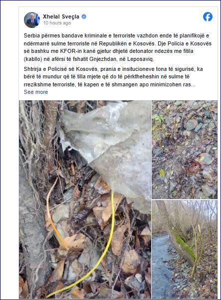 Ministri në detyrë i Brendshëm i Kosovës, Xhelal Sveçla, ka pretenduar se “Serbia përmes bandave kriminale e terroriste vazhdon ende të planifikojë e ndërmarrë sulme terroriste në Republikën e Kosovës”.