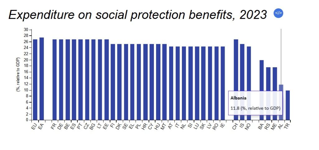 Sipas një krahasimi të Eurostat që i takon vitit 2023 vendet e Bashkimit Europian shpenzojnë mesatarisht mbi 25% të PBB-së për mbrojtje sociale, ndërsa Shqipëria vetëm rreth 11%, duke u pozicionuar në fund të listës, duke lënë pas vetëm Turqinë.