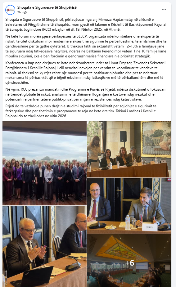 Shoqata e Siguruesve të Shqipërisë, përfaqësuar nga znj Mimoza Hajdarmataj në cilësinë e Sekretares së Përgjithshme të Shoqatës, mori pjesë në takimin e Këshillit të Bashkëpunimit Rajonal të Europës Juglindore (RCC) mbajtur në dt 19. Nëntor 2025, në Athinë.