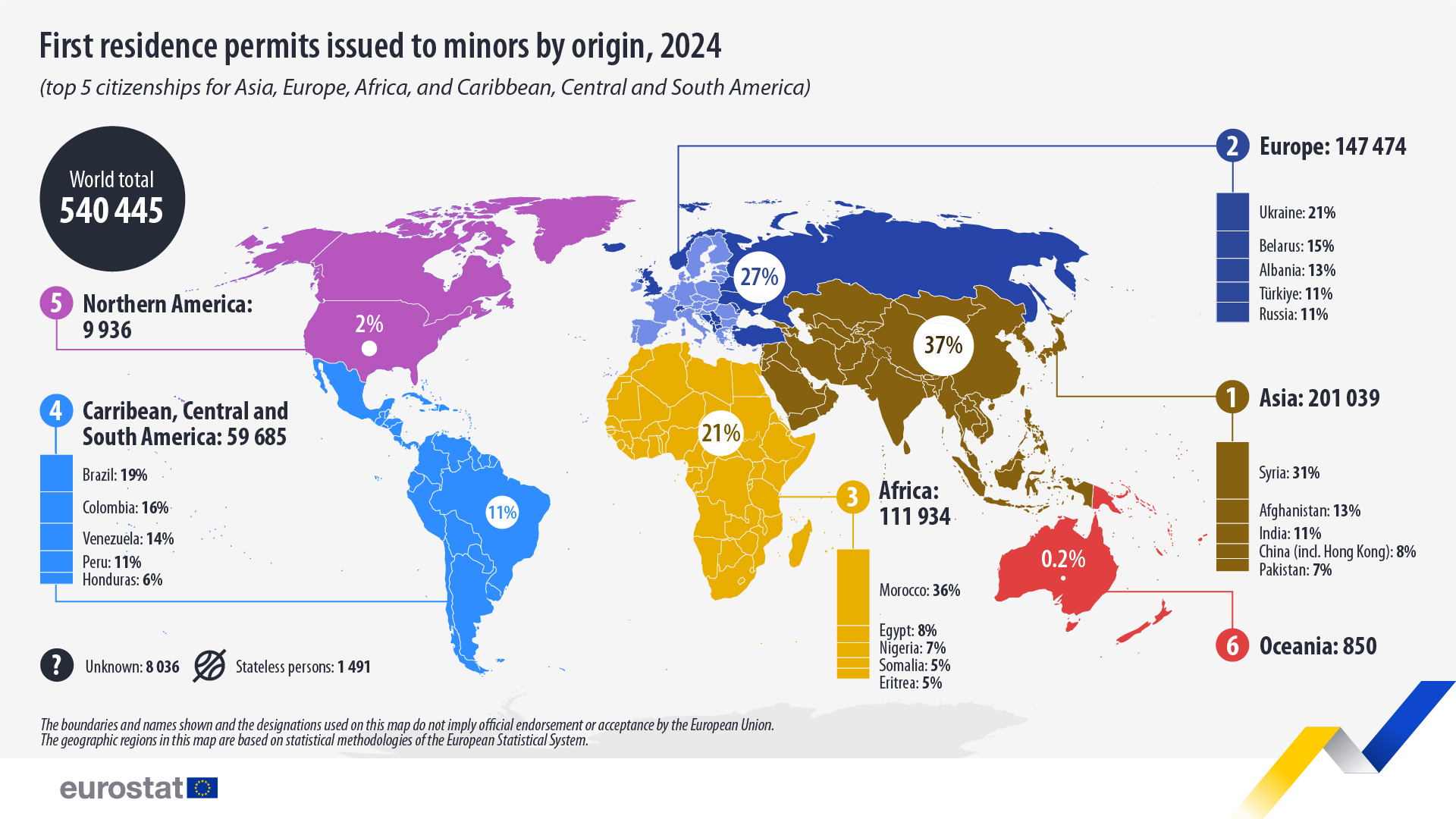 Duke parë shtetësinë e të miturve që morën leje të para qëndrimi në BE për të gjitha arsyet, 37% ishin shtetas të vendeve aziatike, 27% europianë jo-BE, 21% nga vendet afrikane, 11% nga Karaibet, Amerika Qendrore dhe Amerika e Jugut, ndërsa 2% ishin shtetas të Amerikës së Veriut.