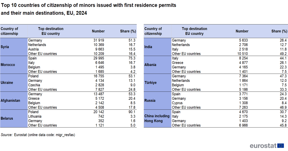 Siria përbënte 12% të totalit të lejeve të para të lëshuara për të mitur në BE, e ndjekur nga Maroku me 7% dhe Ukraina me 6%./E.Zito