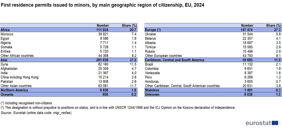Në vitin 2024, vendet e BE-së lëshuan 540,445 leje të para qëndrimi për qytetarë jo-BE nën moshën 18 vjeç.
