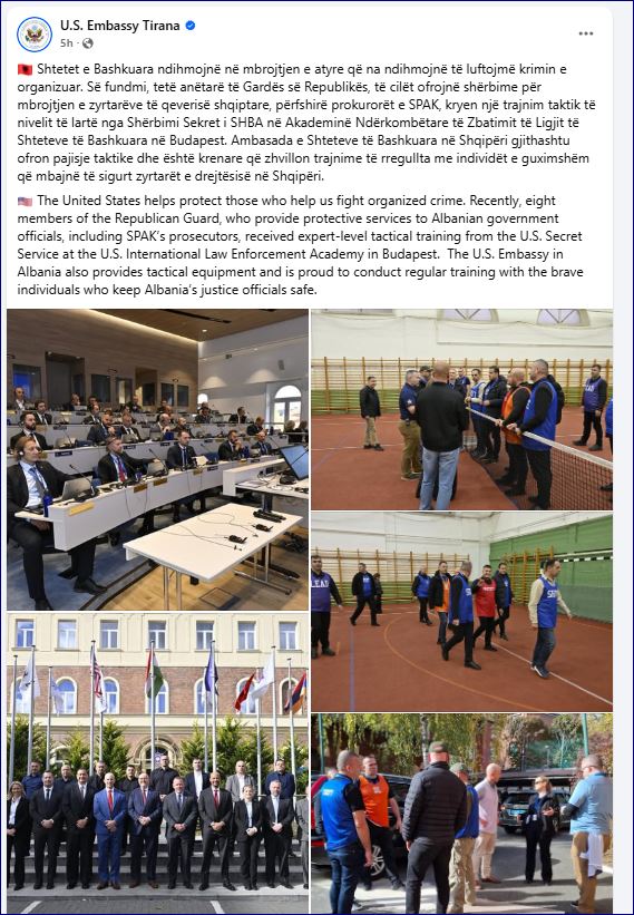 “Shtetet e Bashkuara ndihmojnë në mbrojtjen e atyre që na ndihmojnë të luftojmë krimin e organizuar”. Kështu thuhet në njoftimin e Ambasadës së SHBA në Tiranë, ku bëhet me dije se së fundmi, tetë anëtarë të Gardës së Republikës, të cilët ofrojnë shërbime për mbrojtjen e zyrtarëve të qeverisë shqiptare, përfshirë prokurorët e SPAK, kryen një trajnim taktik të nivelit të lartë nga Shërbimi Sekret i SHBA në Akademinë Ndërkombëtare të Zbatimit të Ligjit të Shteteve të Bashkuara në Budapest.