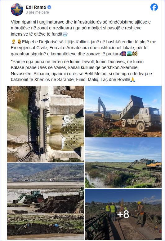 Kryeministri Edi Rama ka ndarë pamjet nga punimet ku shkruan se “ekipet e Drejtorisë së Ujitje-Kullimit janë në bashkëpunim të ngushtë me Emergjencat Civile, Forcat e Armatosura dhe institucionet lokale, për të garantuar sigurinë e komuniteteve dhe të zonave të prekura”.
