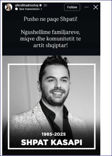 Afërdita Dreshaj, ish-partnerja e Shpat Kasapit, ka shprehur ngushëllimet e saj për lajmin se këngëtari u nda nga jeta në moshën 40-vjeçare, pas një sulmi në zemër.