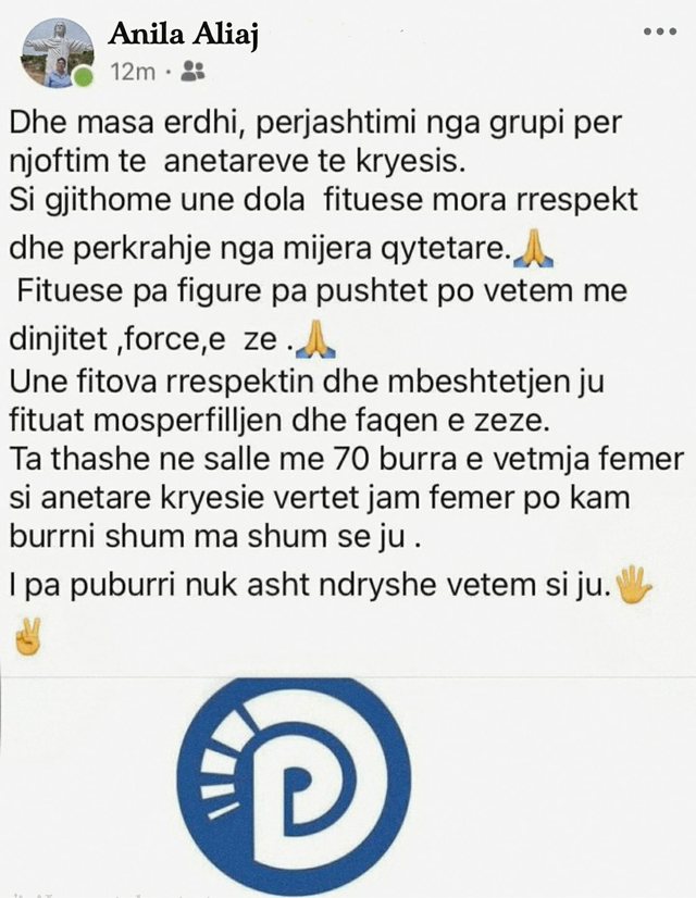 “Dhe masa erdhi, përjashtimi nga grupi për njoftim të anëtarëve të kryesisë. Si gjithmonë, unë dola fituese, mora respekt dhe përkrahje nga mijëra qytetarë. Fituese pa figurë, pa pushtet, por vetëm me dinjitet, forcë e zë”, shkruan ajo.