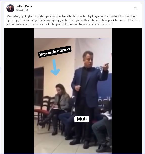 “Mirë Muli, që kujton se është pronar i partisë dhe tenton t’i mbyllë gojën dhe pastaj i tregon derën një zonje, e përsëris një zonje, një gruaje, vetëm se ajo po thotë të vërtetën, po Albana që duhet të jetë në mbrojtje të grave demokrate, pse nuk reagon? Ncnccncncncncnncncn…“, shkruan Julian Deda.