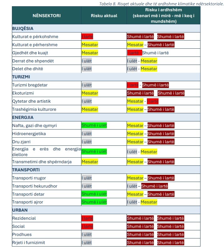 “Vlerësimet tregojnë se risqet kombëtare klimatike në Shqipëri vijnë duke u rritur me kalimin e kohës, si edhe pesimizmin e skenarit. Sektorët e zhvillimit urban, bujqësisë dhe turizmit kanë nivelin më të lartë të riskut, ndërsa sektorët e energjisë dhe transportit kanë nivele më të ulëta (vlen për risqet aktuale dhe ato të ardhshme).