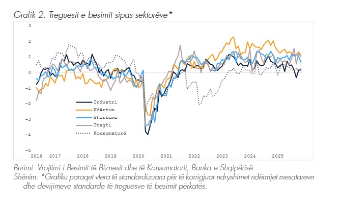 Dy sektorët, që kanë udhëhequr rritjen vitet e fundit kanë shënuar dhe rënien më të lartë të besimit në ekonomi, përkatësisht ndërtimi dhe shërbimet, me këto të fundit që lidhen direkt me ecurinë e turizmit. Edhe tregtia nuk paraqet një panoramë positive.