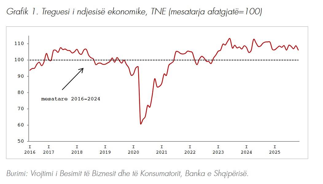 Banka e Shqipërisë bëri të ditur Treguesi i ndjesisë ekonomike (TNE) shënoi nivelin 106.2 në muajin nëntor, me rënie prej 2.6 pikësh, por duke mbetur rreth 6 pikë mbi mesataren afatgjatë. Rënia e TNE-së u ndikua nga ulja e besimit të bizneseve, ndërkohë që besimi konsumator u përmirësua.