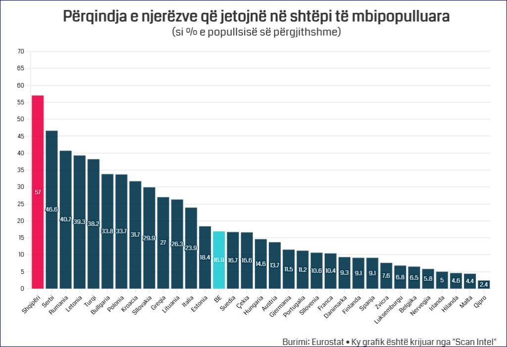 Në një kohë kur çështja e strehimit po bëhet gjithnjë e më qendrore në debatet shoqërore, të dhënat e fundit të Eurostat-it për vitin 2024 vendosin Shqipërinë në një pozicion që kërkon vëmendje të veçantë. Më shumë se gjysma e popullsisë jeton në banesa të mbipopulluara, përqindja më e lartë ndër të gjitha vendet e analizuara. Ky realitet, që prek mënyrën se si shqiptarët jetojnë, punojnë dhe rrisin familjet e tyre, flet qartë për një sfidë të thellë sociale dhe ekonomike.