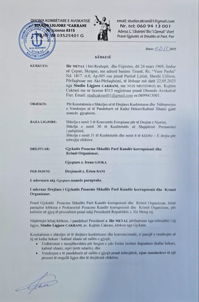 Me të njëjtën kërkesë si Erion Veliaj, Ilir Meta është duke u bërë GJKKO-së për të dalë nga burgu, që ai e quan “kafazi i gjykatës”. Ish Presidneti kërkon të vendoset “në kafaz metalik në gjykatë”, pasi sipas tij, është adresimi “poshtërues dhe çnjerëzor”.