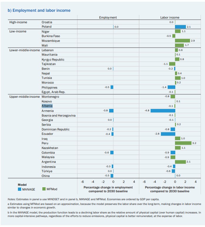 Ndikimi në të ardhurat nga puna është më i theksuar. Shqipëria regjistron rënie rreth -0.1% deri në vitin 2030, çka sinjalizon se pagat reale dhe të ardhurat nga puna pritet të mbeten të nënshtruara ndaj presioneve të produktivitetit të ulët dhe kërkesës së ngadalësuar për fuqi punëtore.