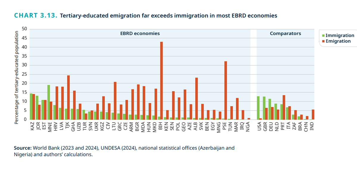 Shqipëria ka nivel të lartë të emigracionit në popullsinë e arsimuar në vitet 2023-2024 dhe kthime shumë më të ulëta të tyre krahasuar me 38 vende të Rajonit të BERZH.
