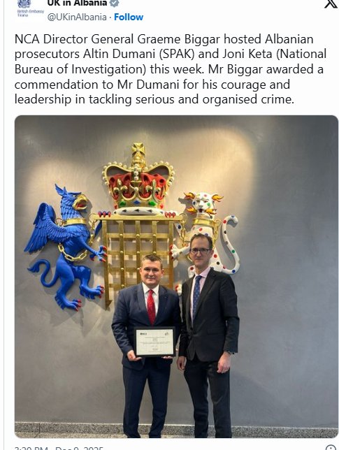 “Drejtori i Përgjithshëm i NCA-së, Graeme Biggar, priti këtë javë prokurorët shqiptarë Altin Dumani (SPAK) dhe Joni Keta (Byroja Kombëtare e Hetimit). Z. Biggar i akordoi një vlerësim z. Dumani për guximin dhe lidershipin e treguar në luftën kundër krimit të rëndë dhe të organizuar”, njoftoi ambasada britanike.