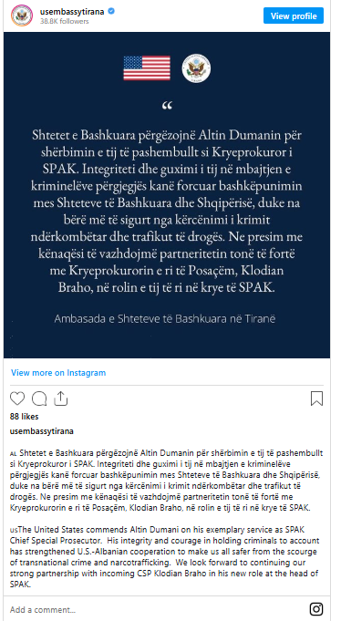 Shtetet e Bashkuara përgëzojnë Altin Dumanin për shërbimin e tij të pashembullt si Kryeprokuror i SPAK.