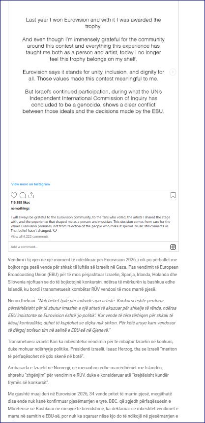 Në një postim në Instagram, Nemo shkroi: “Edhe pse jam jashtëzakonisht mirënjohës për komunitetin rreth këtij konkursi dhe gjithçka që kjo përvojë më ka mësuar si person dhe artist, sot nuk ndjej më se ky trofe i përket raftit tim.”