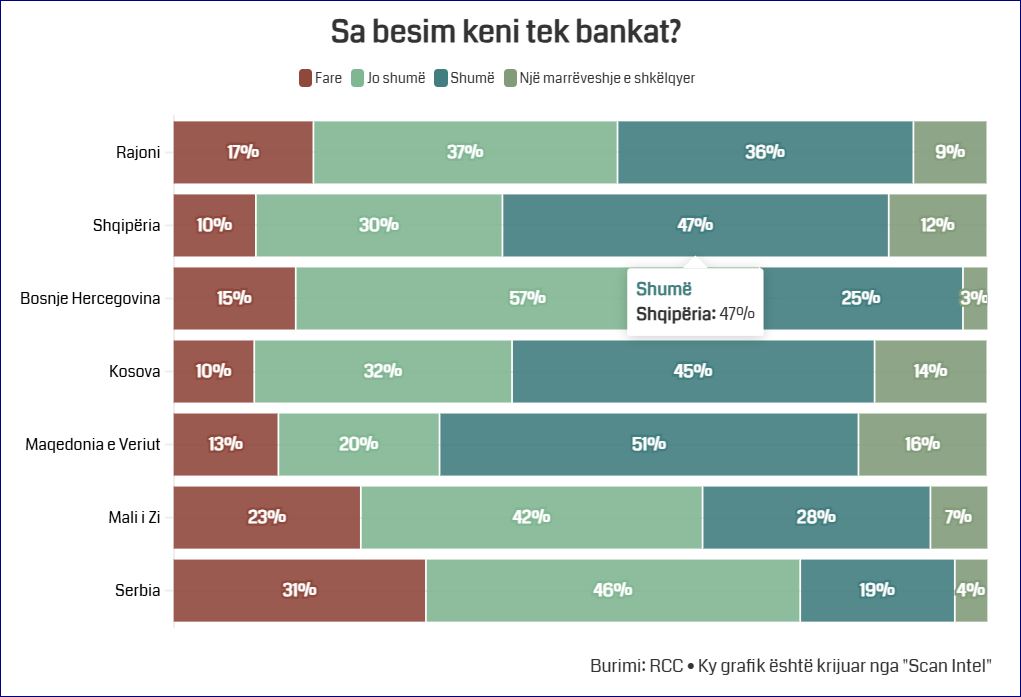 Shqipëria duke se shfaq një nivel të lartë besimi në bankat e vendit, sipas Anketës së Opinionit Publik të Barometrit të Ballkanit për vitin 2025. Sipas të dhënave rreth 47% e të anketuarve shqiptarë raportuan një “besim të madh” në sistemin bankar, ndërsa 30% shprehën një besim të konsiderueshëm. Vetëm 10% e qytetarëve thanë se nuk kishin aspak besim, duke treguar një klimë të qëndrueshme besimi ndaj institucioneve financiare.
