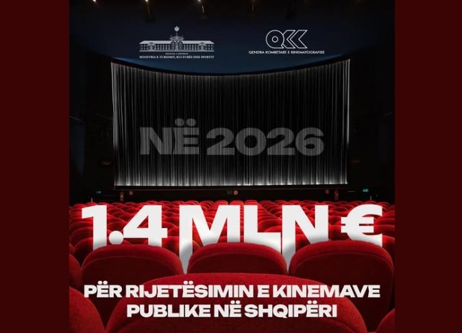 Ministria e Turizmit, Kulturës dhe Sportit do të investojë rreth 1.4 milionë euro për rijetësimin e kinemave në Shqipëri gjatë vitit 2026. Lajmi u bë i ditur nga ministri Blendi Gonxhja përmes një postimi në rrjetet sociale, ku e cilësoi këtë nismë si një hap të rëndësishëm drejt rikthimit të magjisë së filmit tek publiku.