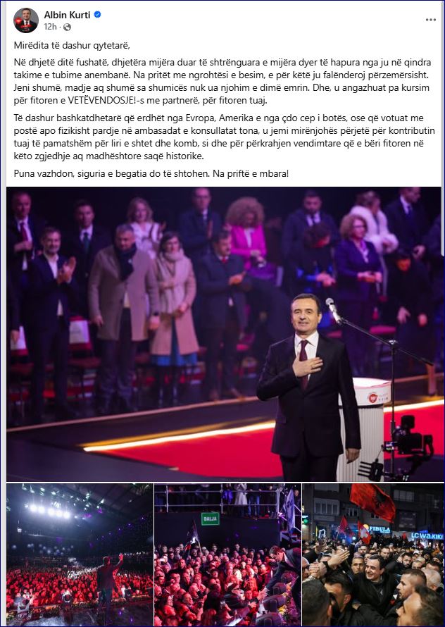 Me një mesazh falënderues u është drejtuar Albin Kurti të gjithë votuesve të partisë së tij në zgjedhjet e jashtëzakonshme që u mbajtën dje në Kosovë, dhe që i dhanë mundësinë të krijojë qeverinë pa opozitën.