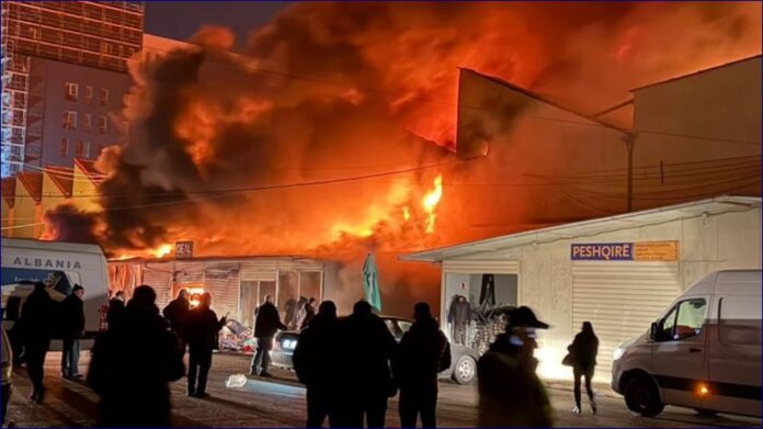 Përmasa të frikshme ka marrë zjarri që ka përfshirë tregun e rrobave të përdorura në lagjen 5 Maji në Tiranë.