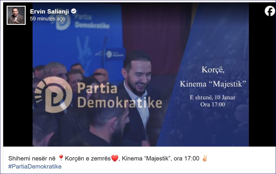 Ish-deputeti i PD, Ervin Salianji ka njoftuar takimin e radhës me demokratët dhe mbështetësit e tij.