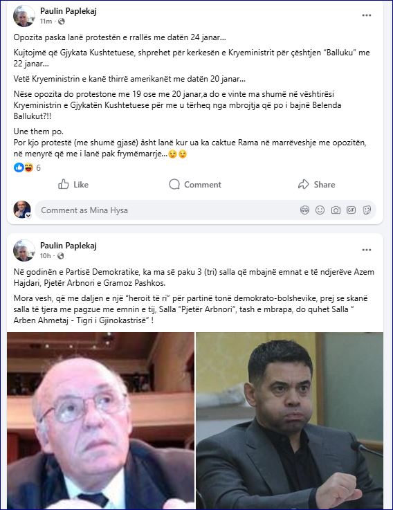 Paulin Paplekaj është një demokrat kritik që gjithnjë ka kërkuar reformimin e PD dhe kthimin e saj tek vlerat dhe kontribuesit dhe jo sërvilët dhe përfituesit. Ai prej vitesh ka ka qenë kritik sikurse në harkun e 12 orëve të fundit ka vënë dy statuse ironizuese me aksionet e opozitës dhe sjelljen e saj. Përmes postimit të parë në FB ai ai ironizon himnizimin e Ahmetajt sikrse në të dytin përmes argumenteve të tij pohon se data 24 janar protësts së opozitës është caktuar nga Rama