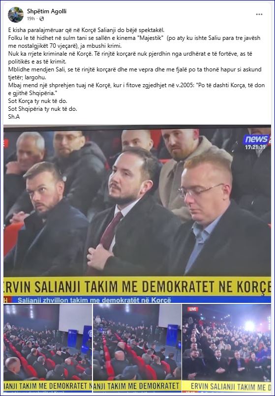 Ish Kandidati për deputet i Koalicionit Euroatlantik në Korcë Shpetim Agolli në një reagim në rrjetin social FB ka reaguar për takimin masiv të Ervin Salianjit në Korcë duke pohuar se e kishte paralajmëruar se do te ishte i nje permase te tille. Zoti Agolli pohon se Korca nuk e do me Saliun, te rinjte po i thone hapur largohu.