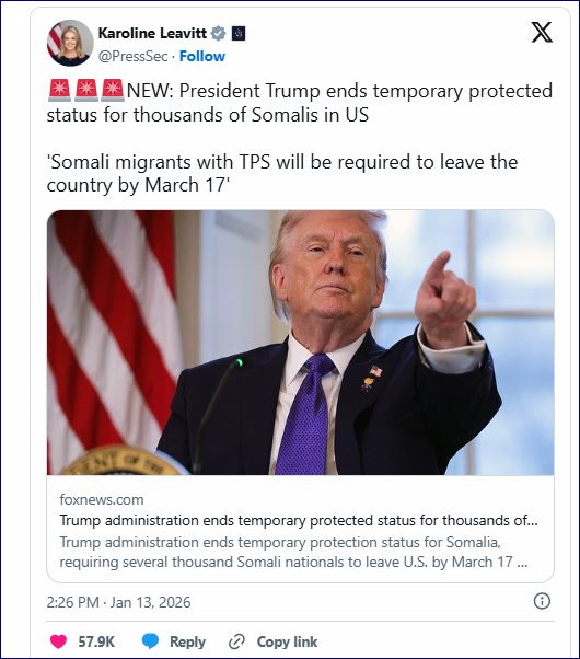 “Emigrantët somalezë me TPS do të detyrohen të largohen nga vendi deri më 17 mars,” shkroi Leavitt në X, duke cituar një artikull të Fox News që e publikoi i pari lajmin.