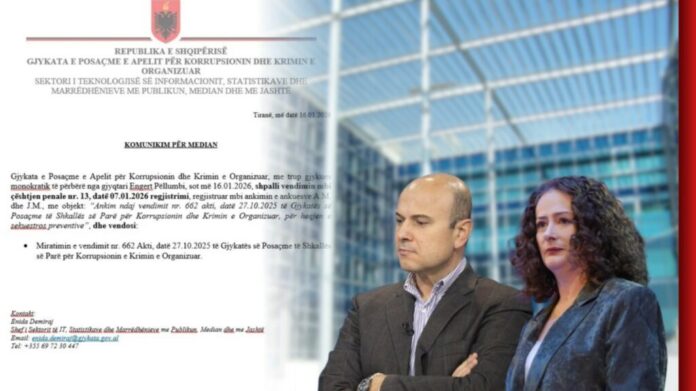 “Ankim ndaj vendimit nr. 662 akti, datë 27.10.2025 të Gjykatës së Posaçme të Shkallës së Parë për Korrupsionin dhe Krimin e Organizuar, për heqjen e sekuestros preventive”, dhe vendosi: Miratimin e vendimit nr. 662 Akti, datë 27.10.2025 të Gjykatës së Posaçme të Shkallës së Parë për Korrupsionin e Krimin e Organizuar”, thuhet në njoftimin zyrtar të gjykatës.