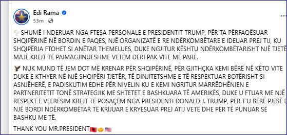 Nuk mund të jem më krenar për Shqipërinë, për gjithçka kemi bërë në këto vite duke e kthyer atë në një Shqipëri tjetër, të denjë dhe të respektuar botërisht si asnjëherë më parë. Pa diskutim, edhe për nivelin ku e kemi ngritur marrëdhënien e partneritetit tonë strategjik me Shtetet e Bashkuara të Amerikës, duke u ftuar me një respekt dhe vlerësim të posaçëm nga Presidenti Donald J. Trump për t’u bërë pjesë e një bordi ndërkombëtar të krijuar dhe të kryesuar prej tij, si dhe për të punuar së bashku me të.