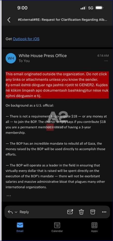 “Nuk ekziston asnjë kërkesë për të kontribuar 1 miliard dollarë, apo ndonjë shumë financiare për t’u bashkuar me Bordin e Paqes (BOP)”.