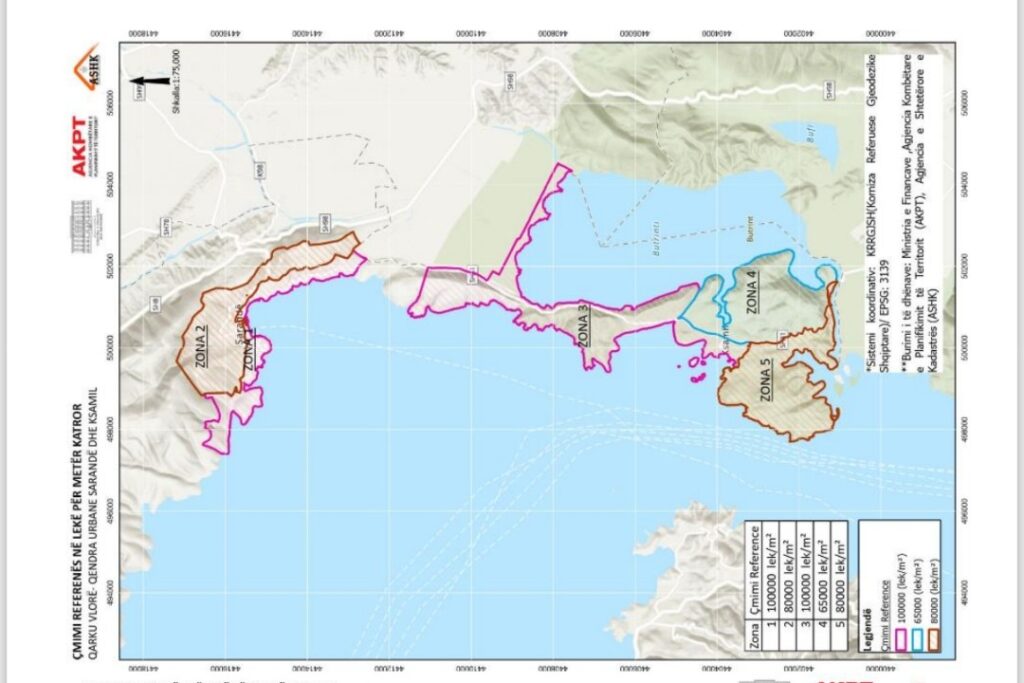 Zona rurale e Vlorës, pra pas vijës bregdetare përfshirë fshatrat: Dukat, Dukat Fshat, Tragjas, Radhimë, Bestrovë, Babicë e Madhe, Babicë e Vogël, Hoshtimë, Kaninë, Kërkovë, Nartë, Sherishtë, Panaja, Xhyherinë, Zvërnec, Sazan, Novoselë, Aliban, Bishan, Mifol, Poro, Dëllenjë, Delisuf, Trevllazër, Cerkovinë, Skrofotinë, Fitore, Akërni, Shushicë, Bunavi, Beshisht, Grabian, Drithas, Mekat, Llakatund, Çeprat, Risili do të kenë çmim reference 61,800 lekë për metër katror. Ky është çmimi aktual i referencës për qytetin e Vlorës.