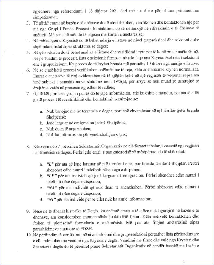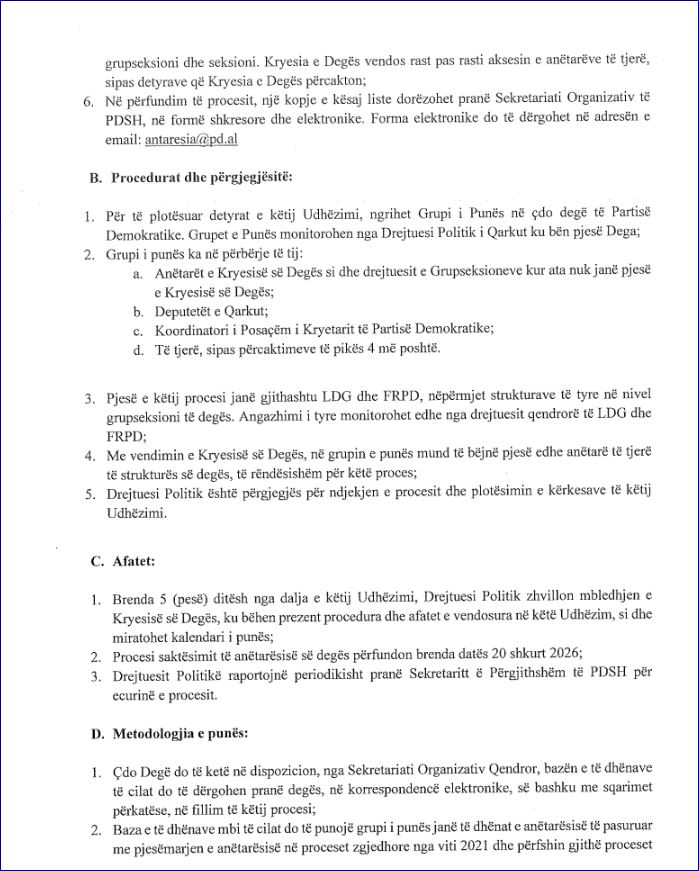 Në udhëzimin që u është dërguar degëve të Partisë Demokratike thuhet se e gjithë databaza e anëtarësisë do të dorëzohet në mënyrë elektronike. Më pas, kërkohet që të gjithë anëtarët të kontaktohen individualisht për të konfirmuar ose jo vijimin e anëtarësisë në selinë blu. Në rast të moskonfirmimit, ata do të fshihen nga regjistri i anëtarësisë.