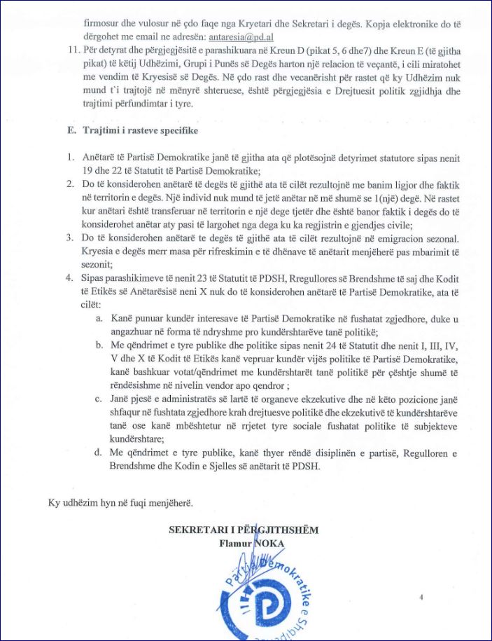 Sipas udhëzimit, nuk do të konsiderohen më anëtarë të PD-së ata që: kanë dalë kundër partisë duke u rreshtuar me forca të tjera politike kundërshtare; kanë vepruar kundër vijës politike të PD-së; kanë bashkuar votat apo qëndrimet me kundërshtarët politikë; janë pjesë e administratës dhe kanë dalë në fushatë për kundërshtarët;