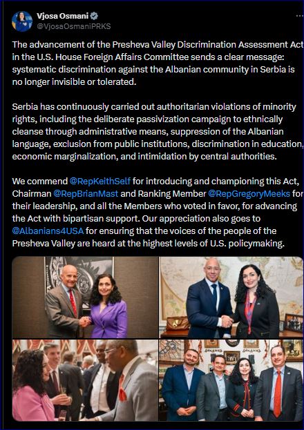 Presidentja e Kosovës, Vjosa Osmani ka vlerësuar avancimin e Aktit të Vlerësimit të Diskriminimit në Luginën e Preshevës në Komitetin e Punëve të Jashtme të Dhomës së Përfaqësuesve të ShBA-së, duke thënë se kjo dërgon një mesazh të qartë se diskriminimi sistematik ndaj komunitetit shqiptar në Serbi nuk do të mbetet më i padukshëm apo i toleruar.