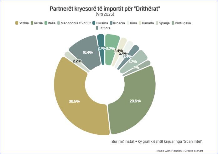 Në vitin 2025, importet e drithërave të Shqipërisë dominohen qartë nga Serbia, e cila mban 36.5% të peshës totale, duke u konfirmuar si partneri kryesor i furnizimit. Rusia renditet e dyta me 29.6%, duke ruajtur një rol të rëndësishëm, por pa arritur pozitat dominuese të viteve para luftës në Ukrainë. Pas tyre, pesha e importeve shpërndahet në mënyrë më të fragmentuar, ku Italia mbulon 5.2%, e ndjekur nga Maqedonia e Veriut me 4.2%. Ukraina mban 2.7%, ndërsa Kroacia, Kina dhe Kanadaja kontribuojnë secila me rreth 2.4%.
