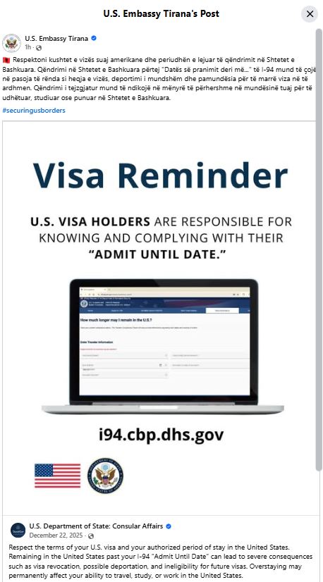 “Respektoni kushtet e vizës suaj amerikane dhe periudhën e lejuar të qëndrimit në Shtetet e Bashkuara. Qëndrimi në Shtetet e Bashkuara përtej “Datës së pranimit deri më…” të I-94 mund të çojë në pasoja të rënda si heqja e vizës, deportimi i mundshëm dhe pamundësia për të marrë viza në të ardhmen. Qëndrimi i tejzgjatur mund të ndikojë në mënyrë të përhershme në mundësinë tuaj për të udhëtuar, studiuar ose punuar në Shtetet e Bashkuara.”, thuhet në njoftim./et