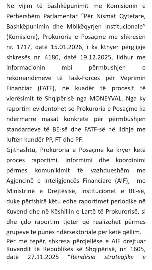 Megjithatë siç rendit edhe në shkresë, SPAK e ka kryer më herët raportimin mbi përmbushjen e rekomandimeve të Task forcës. Ky informim kryhet në kuadër të procesit të Shqipërisë nga Moneyval, Organizata Ndërkombëtare e Monitoritimit kundër pastrimit të parave.