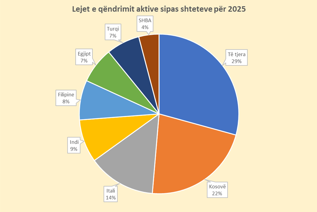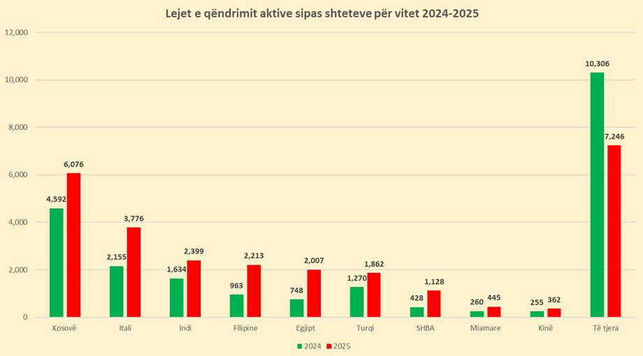 Nga totali prej 27,514 lejesh qëndrimi aktive deri në fund të vitit 2025, shumica e të huajve janë nga Kosova dhe Italia.