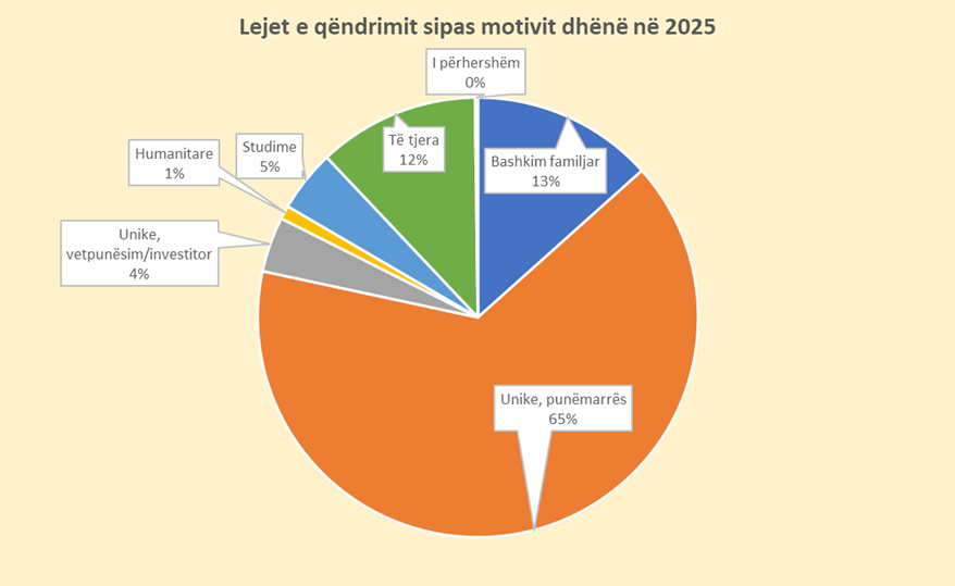 Megjithatë motivi kryesor për pajisjen me leje qëndrimi në Shqipëri vijon të mbetet për çështje punësimi dhe bashkimi familjar.