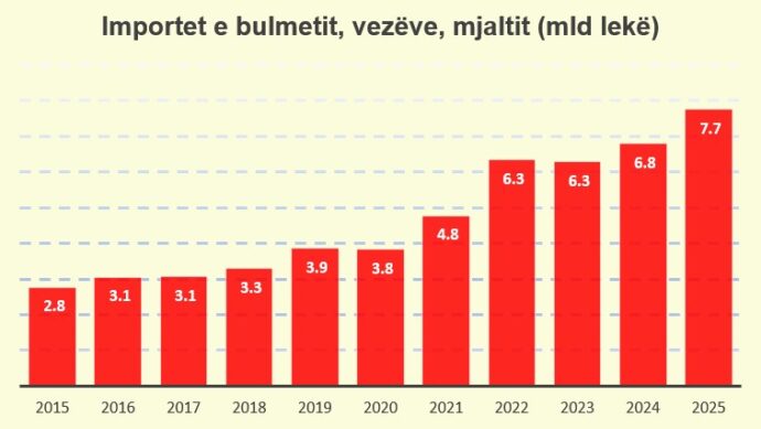 Sipas të dhënave të INSTAT nga tregtia e jashtme, kategoria “Produkte bulmetore, vezët dhe mjalti” ka pësuar një rritje të fortë të vlerës së importit, duke u ngjitur nga 6.8 miliardë lekë në vitin 2024, në rreth 7.7 miliardë lekë në vitin 2025.