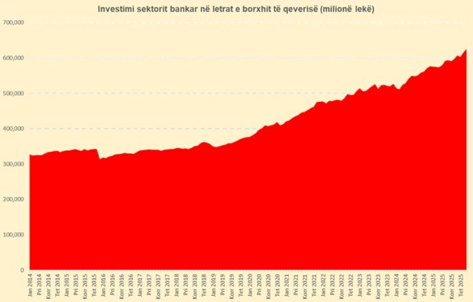 Ekspozimi i sektorit bankar në borxhin e qeverisë shqiptare u rrit më tej gjatë vitit 2025. Statistikat e Bankës së Shqipërisë tregojnë se në fund të vitit të kaluar bankat zotëronin instrumente borxhi të qeverisë shqiptare në vlerën e 625 miliardë lekëve, në rritje me 8.4% krahasuar me një vit më parë.