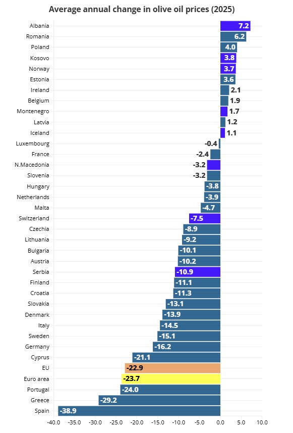 Mes 35 vendeve europiane, Spanja regjistroi rënien më të madhe të çmimeve të vajit të ullirit për konsumatorët në 2025, me 38.9%. Greqia pasoi me një rënie prej 29.2%, ndërsa Portugalia me 24%. Këto ishin të vetmet tre vende ku çmimet ranë më shumë se mesatarja e BE-së.