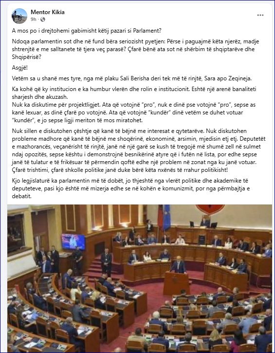 Nuk ka diskutime për projektligjet. Ata që votojnë “pro”, nuk e dinë pse votojnë “pro”, sepse as kanë lexuar, as dinë çfarë po votojnë. Ata që votojnë “kundër” dinë vetëm se duhet votuar “kundër”, e jo sepse ligji meriton të mos miratohet.