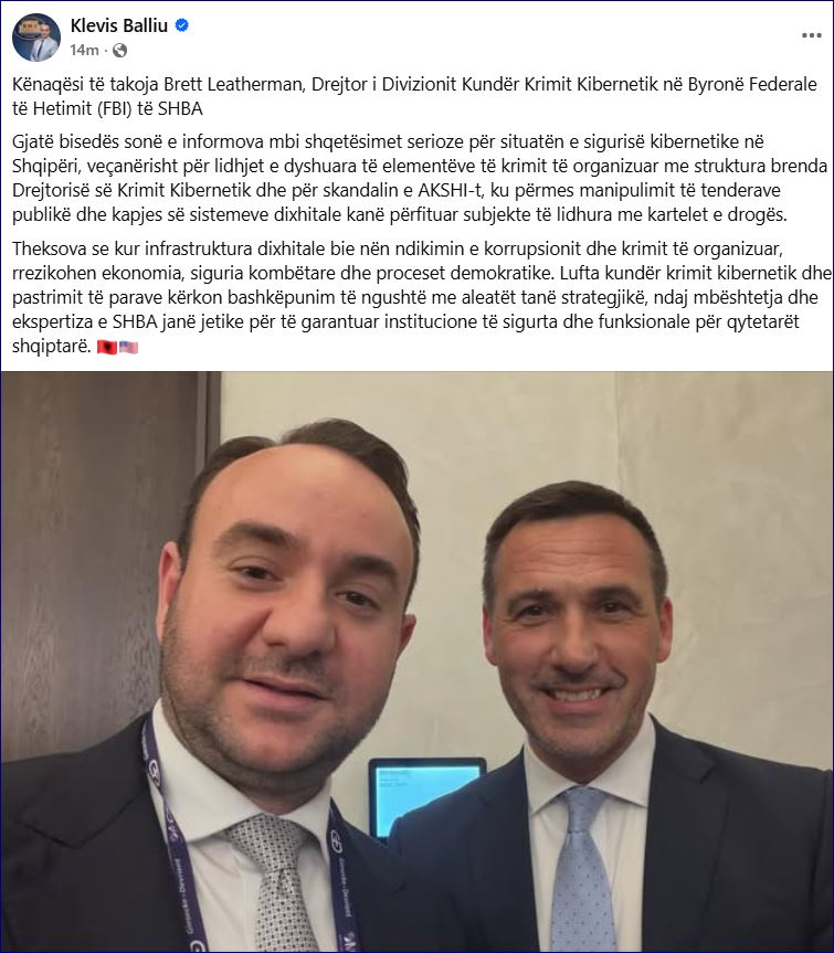 Gjatë bisedës sonë e informova mbi shqetësimet serioze për situatën e sigurisë kibernetike në Shqipëri, veçanërisht për lidhjet e dyshuara të elementëve të krimit të organizuar me struktura brenda Drejtorisë së Krimit Kibernetik dhe për skandalin e AKSHI-t, ku përmes manipulimit të tenderave publikë dhe kapjes së sistemeve dixhitale kanë përfituar subjekte të lidhura me kartelet e drogës.