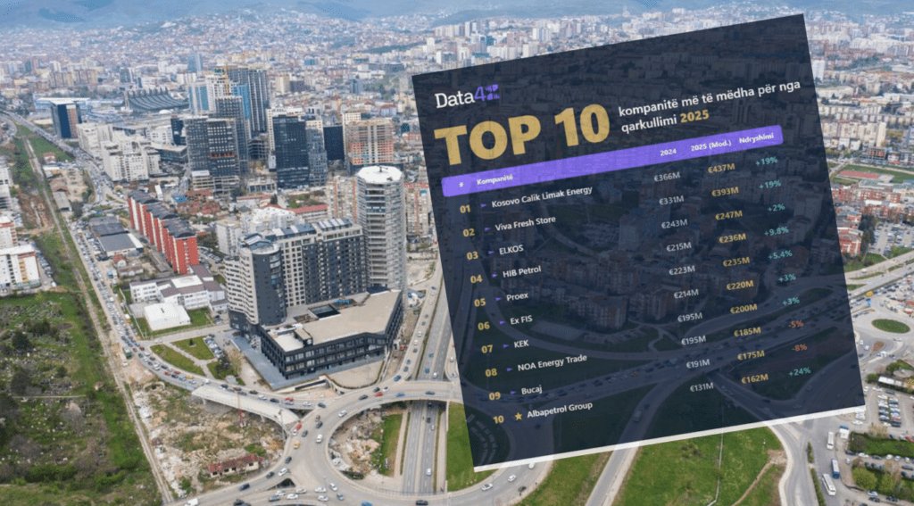 Dhjetë kompanitë më të mëdha në Kosovë realizojnë rreth 2.5 miliardë euro qarkullim në vitin 2025, një rritje e ndjeshme krahasuar me vitin 2024, kur totali ishte afërsisht 2.21 miliardë euro.