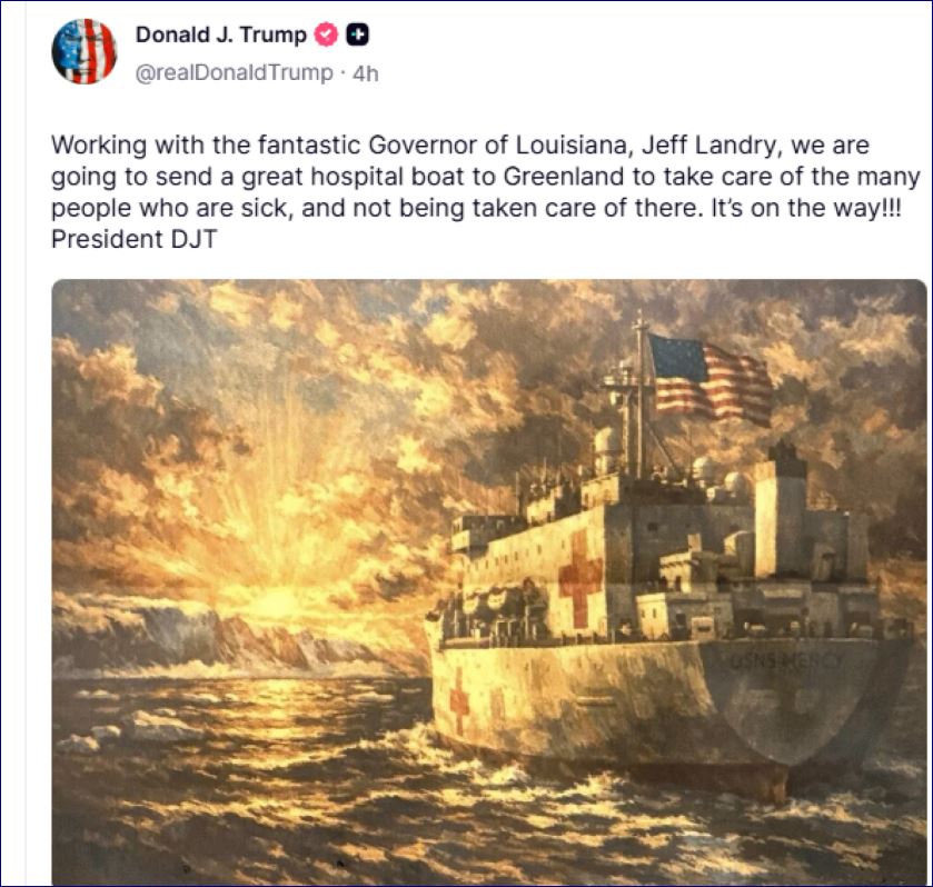 Presidenti i SHBA-së, Donald Trump, tha të shtunën se po punon me Guvernatorin e Luizianës, Jeff Landry, të cilin e ka emëruar si të dërguar të posaçëm për Groenlandën, për të dërguar një spital lundrues në ishullin strategjikisht të rëndësishëm Arktik.