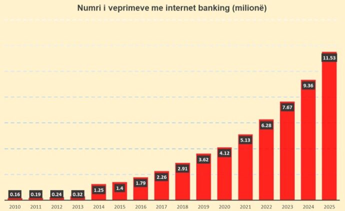 Sipas statistikave të Bankës së Shqipërisë, numri total i veprimeve bankare në distancë arriti në 11.53 milionë, niveli më i lartë i regjistruar ndonjëherë.